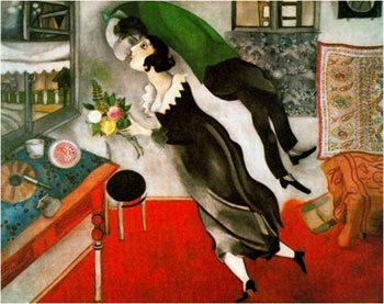 Acá vemos el estilo característico de Chagall, de ingenuidad infantil y con muchas profundidades del inconsciente. Podemos observar su clásica pareja flotando por los aires.
