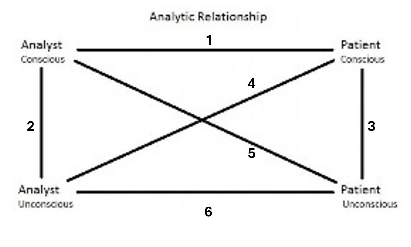 Las flechas en dos vías indican una comunicación y una relación en los dos sentidos. (1) se refiere a la alianza terapéutica. (2) refleja el hecho de que, en análisis, el analista se vale tanto de su propio inconsciente para una comprensión del paciente, como del encuentro con lo que sea que lo convirtió en un sanador herido. Su propio análisis habrá hecho aquí su impacto. (3) representa la etapa inicial del paciente, de la conscienciación de sus problemas, interrumpido por la resistencia y por la dedicación a la persona; (4) y (5) indican el impacto de la relación analítica sobre la vida inconsciente de cada participante, una mezcla de personalidades que llevará a cada cual a algún tipo de enfrentamiento con la posibilidad del cambio personal. (6) propone una comunicación directa entre el inconsciente del analista y el del paciente.