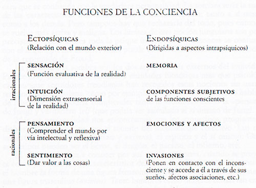Para Jung, la psicología es ante todo una ciencia de la conciencia. El yo consciente se sitúa en el centro, regulando las cuatro funciones fundamentales expuestas, y es como la frontera entre el mundo espacial-externo y el interno-psíquico. Consciencia e inconsciencia se relacionan en cuanto a un sistema autorregulador, comparable a los mecanismos homeostáticos del cuerpo. En 1935, Jung distinguió dos sistemas conscientes: ectopsique (sistema de conexión de la conciencia con las impresiones del ambiente) y endopsique (sistema donde se conectan los contenidos conscientes con los procesos que discurren en el inconsciente). Atribuyó a cada sistema cuatro funciones determinadas. Kriz (198.5, págs. 93-95) las resumió como sigue a continuación: