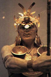 El heredero era despojado de sus vestidos, cubierto con lodo pegajoso o trementina y oro en polvo, y conducido a la balsa. A sus pies se ponían esmeraldas y gran cantidad de objetos de oro, para que los presentara como ofrenda a la diosa de las aguas. También subían a la balsa cuatro caciques, igualmente desnudos, con suntuosos adornos de oro y sus respectivas ofrendas. Entonces, la balsa partía hacia el centro de la laguna, mientras en la orilla, los nativos cantaban y tocaban fotutos, flautas y otros instrumentos musicales, para acompañar la travesía. Pero cuando la balsa alcanzaba la mitad de la laguna todo era silencio. (Galindo Caballero, García López, & Valencia Cuellar, 2003)