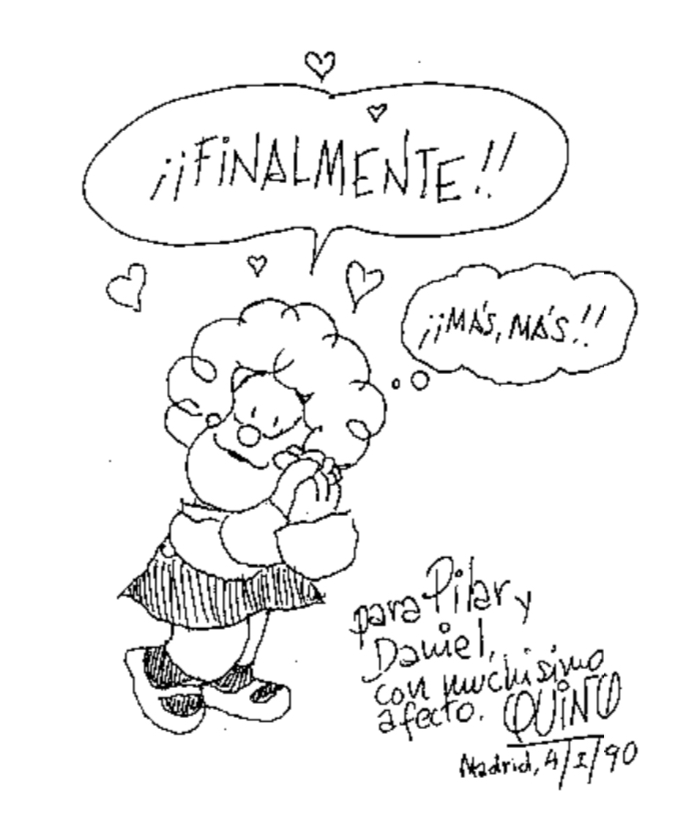 Quino había escogido al más expresivo de sus personajes para darnos la bienvenida. Flotaban corazones en el dibujo y en el ambiente. Emocionado, solo atiné a humedecer con lágrimas de agradecimiento sus manos generosas, dar al Pelado un abrazo de hermano y salir corriendo con el libro y Pilar en el bolsillo. Meses después volví a ver a Quino. Esta vez nos comportamos como adultos. Almorzamos juntos, tomamos vino, conversamos y lo acompañé al montaje de la gran exposición quiniana que organizó en Madrid la Sociedad Estatal del Quinto Centenario entre abril y junio de 1992. Después de que se me apaciguó la taquicardia, he adquirido ya la serenidad suficiente para entender y poder contar lo que siente un goloso del foie gras cuando le permiten conocer la oca.