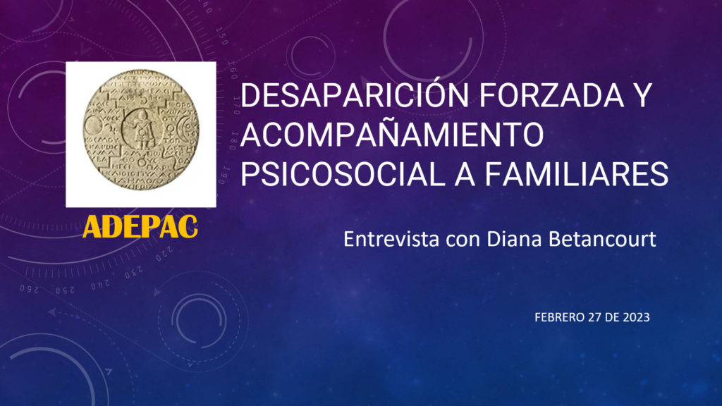 Entrevista-conversatorio con Diana Betancourt, Psicóloga, Consultora de diferentes entidades e Investigadora en el campo Psicosocial. Diana reside actualmente en Suiza, por lo que la entrevista se hizo con anterioridad. Invitada especial al Grupo de Estudio de ADEPAC (Amigos de la Psicología Analítica en Colombia), el encuentro se dio el día 27 de febrero de 2023, 6 pm. Modera: Juan Carlos Alonso.